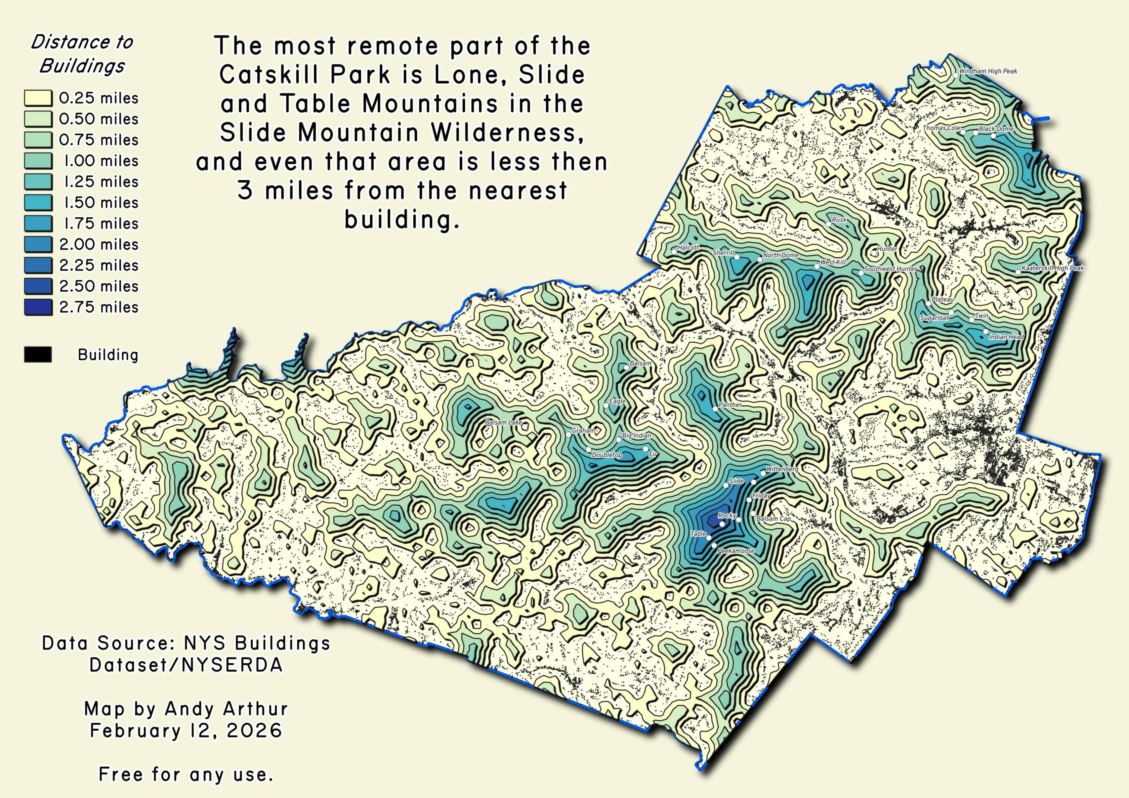 Thematic Map: Distance to Buildings in the Catskill Park Download a High Resolution JPEG Image of the Distance to Buildings in the Catskill Park or an Adobe Acrobat Printable PDF of the Thematic Distance to Buildings in the Catskill Park. More about Catskills...Maps and InteractivesWalton 1948PhoneciaNeversink ReservoirMargaretvilleLanesville, NYContour Map of the CatskillsCatskill Park, 1970Catskill Mountain Peaks on State LandBefore the Pepacton ReserviorAndes – 2022 NAIPNYC DEP Watershed LandsNYC DEP Lands – Year of AcquistionNew York State ClovesNew York City Catskill WatershedNew York City Catskill Reservior WatershedsMedian Age of Residents of the Catskill ParkHow the Catskill Park Voted in 2024 Presidential ElectionDistance to Buildings in the Catskill ParkCatskill Park WIlderness AreasCatskill Park WetlandsCatskill Park WatershedsCatskill Park HillshadeCatskill Park 250 Foot ContoursCatskill ParkCatskill Forest Preserve... photos, maps and other content from from Catskills. Leave a Reply Cancel replyYour email address will not be published. Required fields are marked *Comment * Name * Email * Website Save my name, email, and website in this browser for the next time I comment. Δ